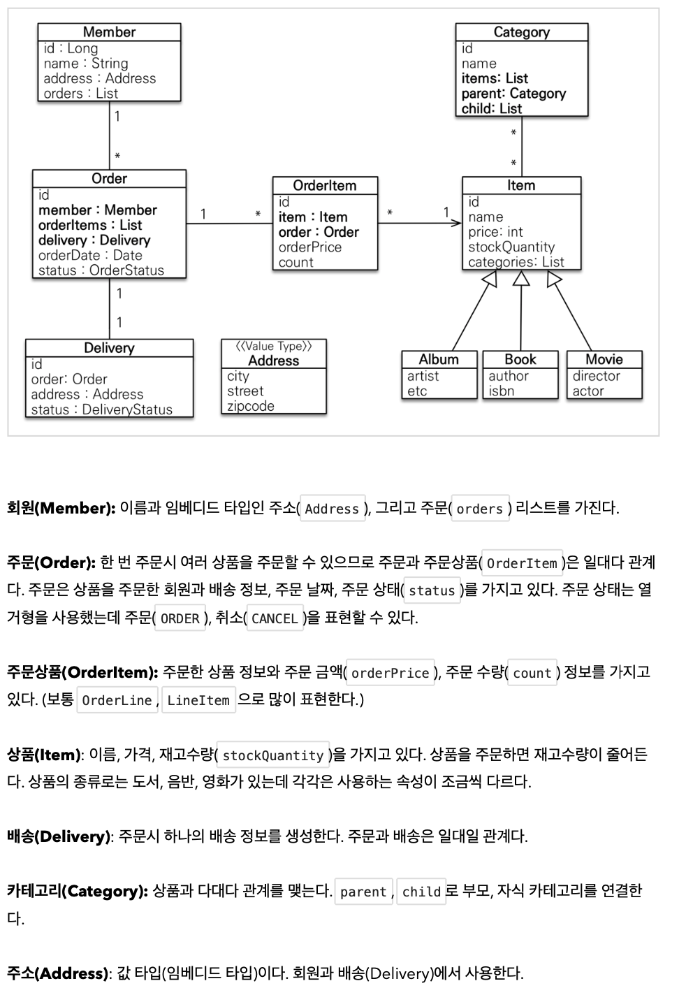 - addressd와 같은 값 타입은 변경 불가능하도록 설계하여야한다. (Setter 제거, public으로 설정하기보다는 protected사용)