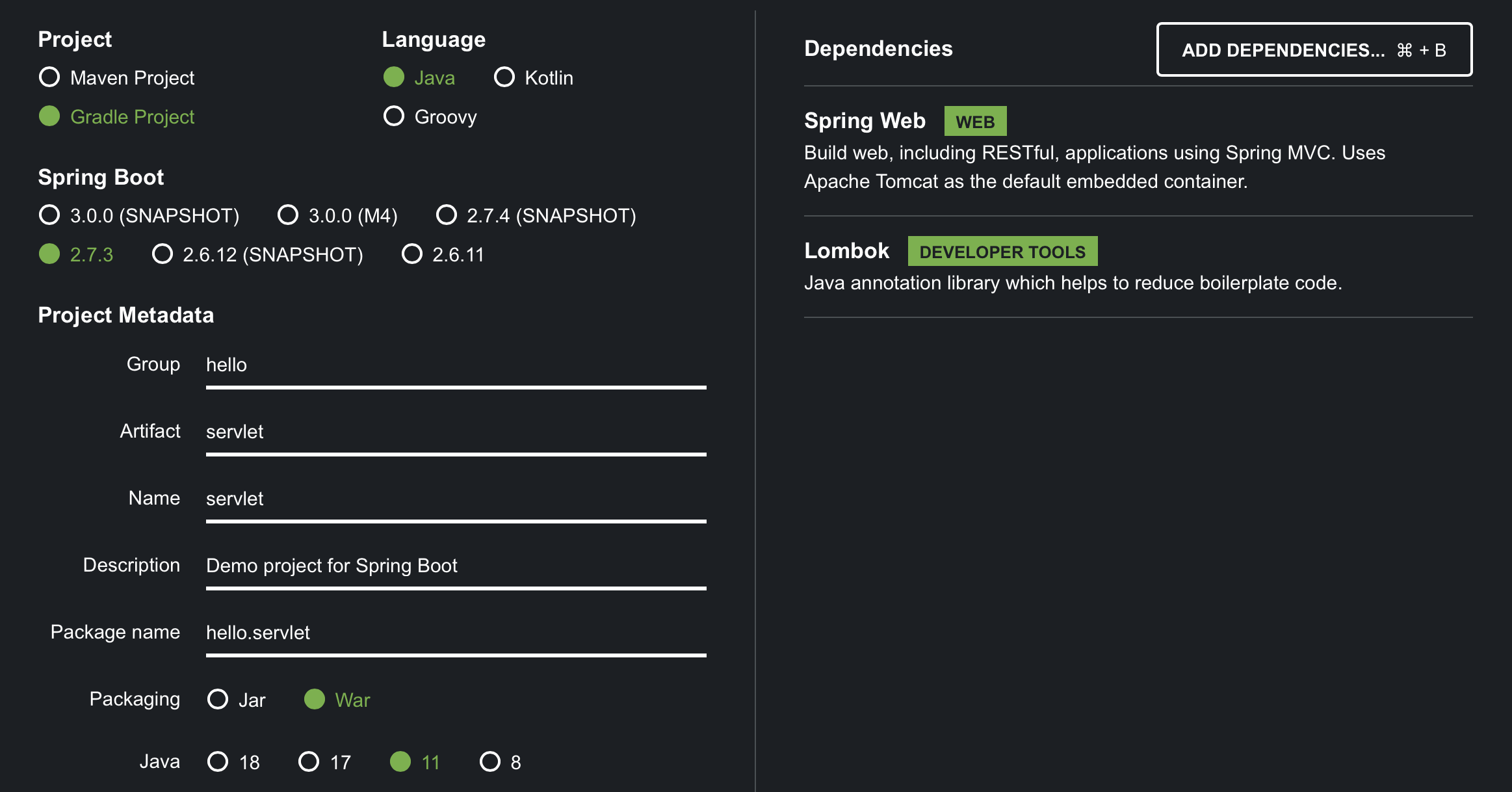 -. 스프링 부트는 톰켓 서버를 내장하고 있기 때문에, 서버 설치없이 편리하게 서블릿 코드를 실행할 수 있다.