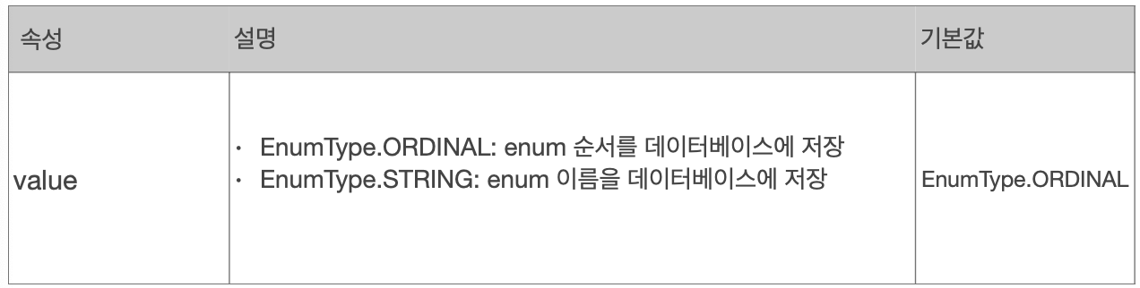 // enum타입이 db에는 없기때문에 Enumerated가 필요