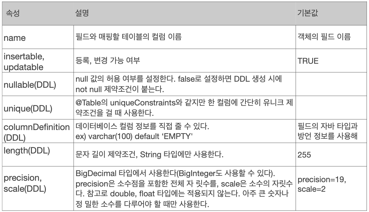 - name: 매핑할 테이블 이름 (default: 엔티티 이름)