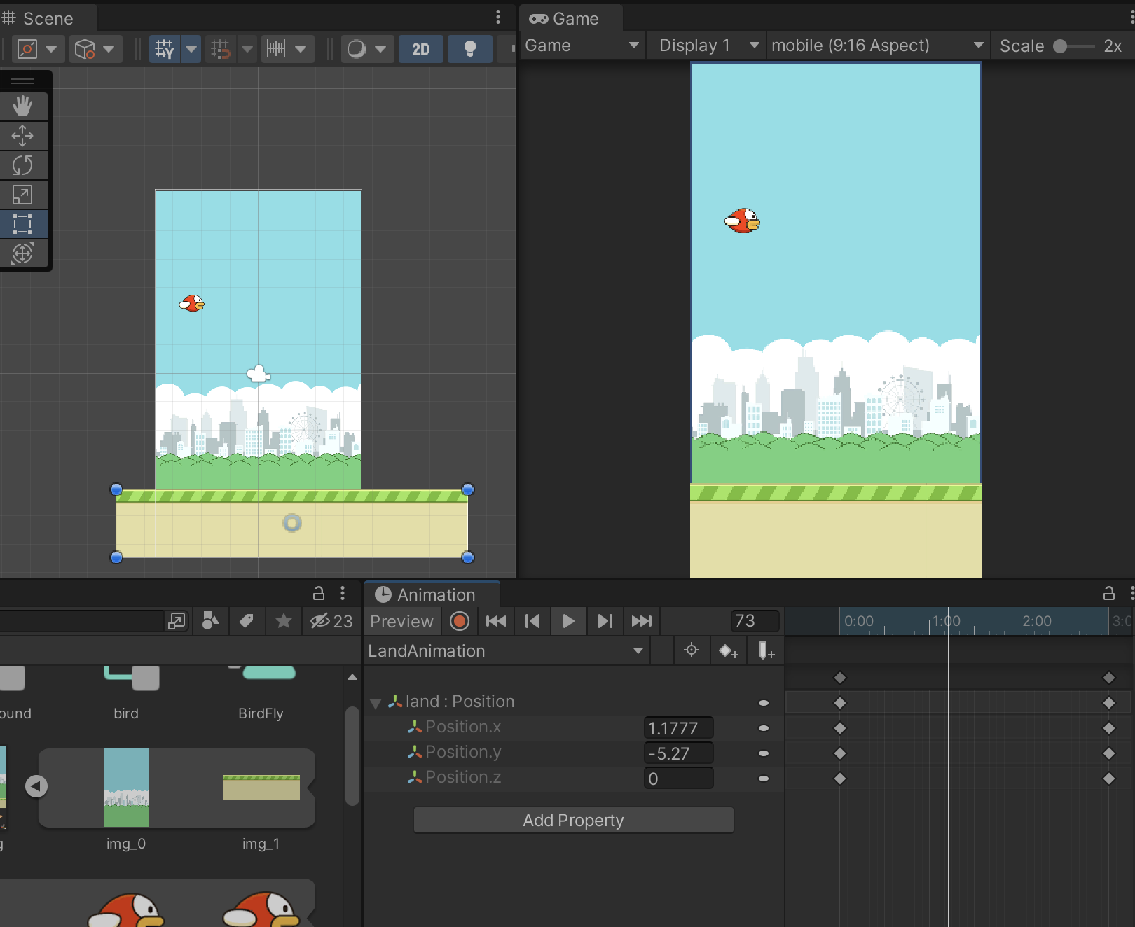 땅을 움직이게 하게 보이기 위해서 Animation을 조금 움직어 땅의 position을 저장하고 원하는 시간에 가서 클릭후 땅을 drag하여 움직여준 후 녹화버튼을 클릭하면 저장된다.