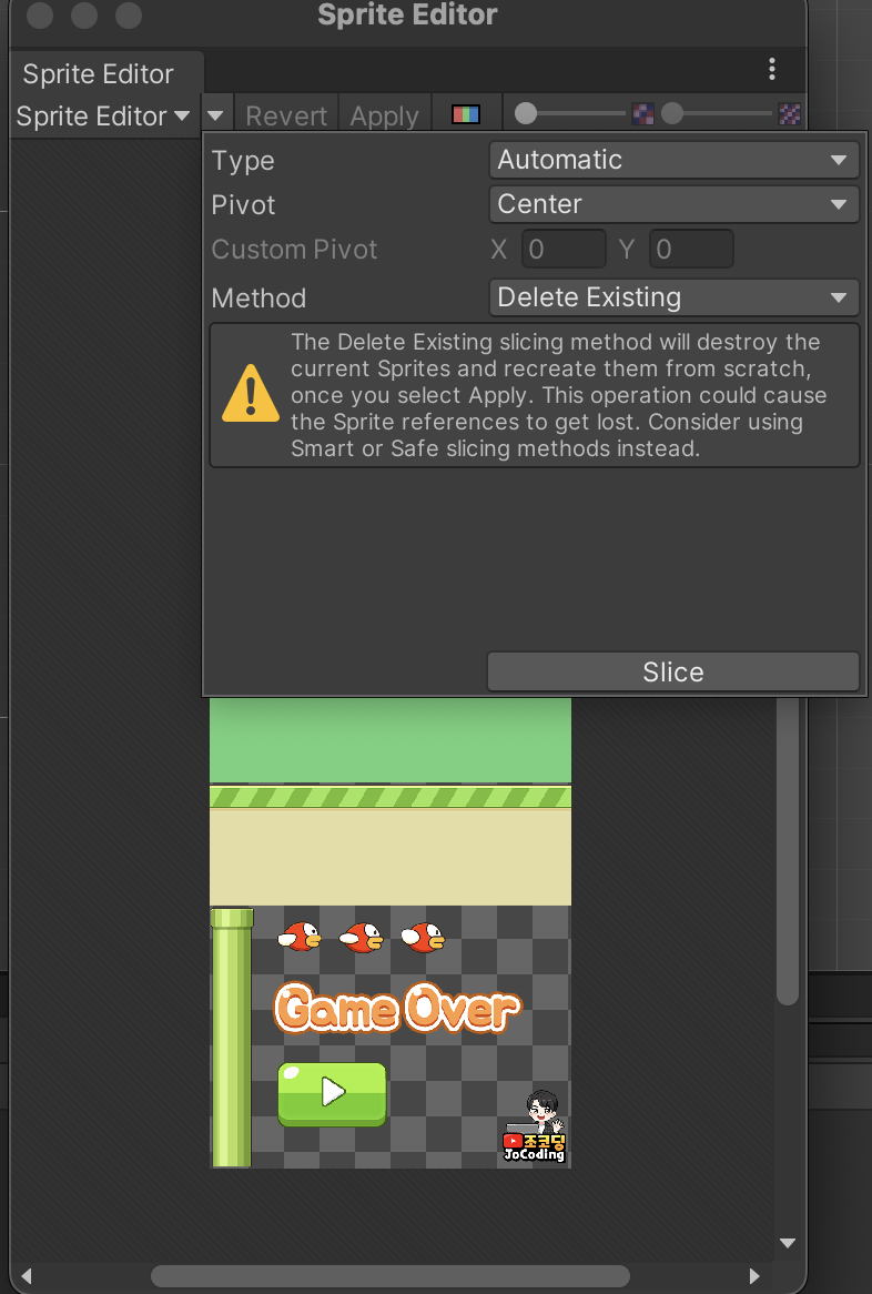 Slice 클릭 > 게임 요소들이 하나씩 나누어 지는 것을 확인할 수 있다.