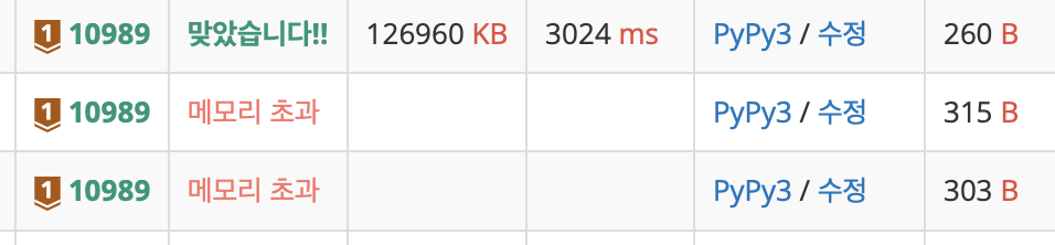 solve 브론즈라고 얕보다가 메모리 문제로 인해서 호되게 당한 문제이다. 그리고 왜인지는 모르겠지만 PyPy3에서는 똑같이 메모리 초과가 나타나지만 Python3 에서는 통과한 문제이다. 혹시 PyPy3에서 안되는 이유를 알고계신다면 공유해주시면 감사하겠습니다.