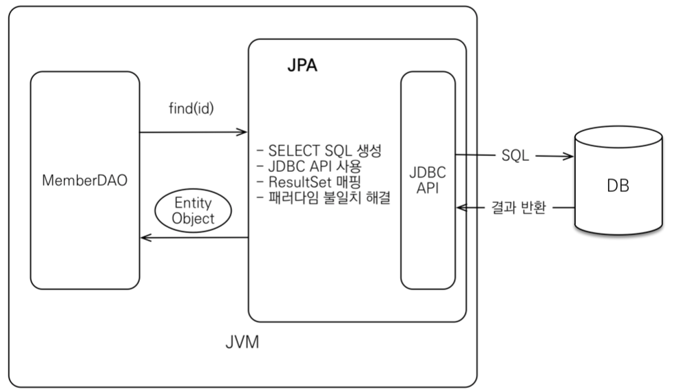 JPA에게 Member 객체를 넘기면 JPA가 적절한 쿼리를 생성하고 JDBC API를 통해서 DB에 보낸 후 결과를 받게 됩니다.
